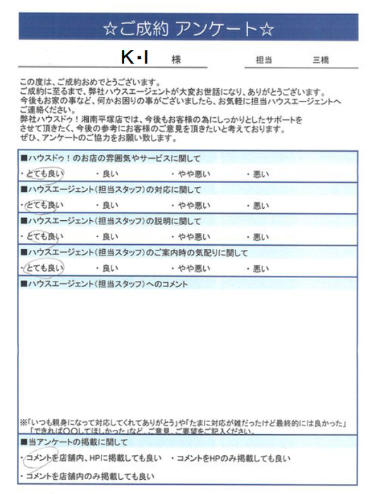 ありがとうございました。Y.I様のお家購入の手伝いが出来、光栄です。 これからも宜しくお願いいたします。