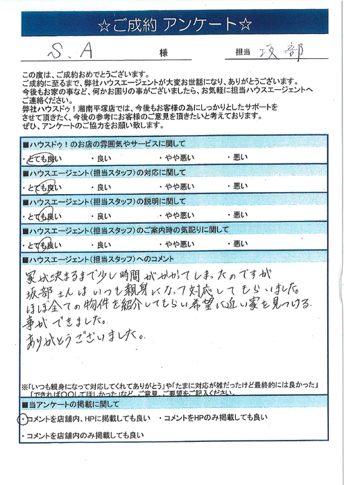 ほぼ全ての物件を紹介してもらい、希望に近い家を見つける事ができました。